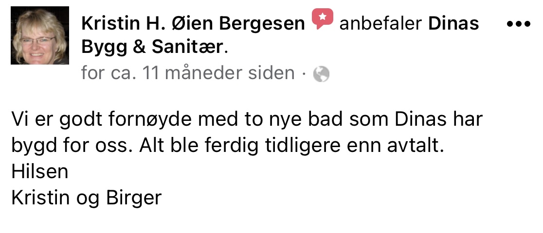 Her viser vi bilder fra noen av våre oppussingsprosjekt. Det er av bad, vaskerom, stue og oppholdsrom. Og vi trekker fram et par referanser, og du kan lese flere på Facebooksiden vår.